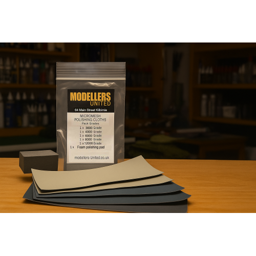 The Modellers United Micromesh 5x Sheets set includes five precision-grade sheets in a range of grits from 3600 up to 12000 grit . This allows for a full progression from initial surface smoothing to a near-gloss polish—perfect for prepping plastic, resin, or even metal surfaces before painting, or for post-paint polishing.